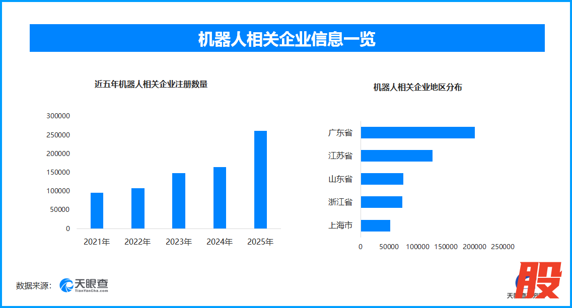 天眼查专业版数据显示,截至目前我国现存在业、存续状态的机器人相关企业超105.8万家。其中,2025年新增注册相关企业超26.1万余家,从企业注册数量趋势来看,近五年间,机器人相关企业的注册数量呈现出逐年增长的态势,并在2025年达到顶峰。